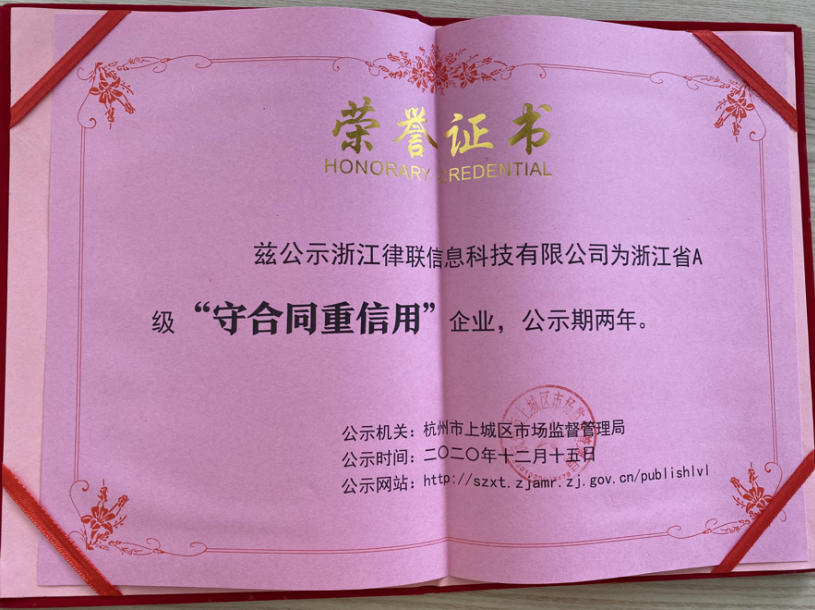 2020年12月,浙江律聯(lián)信息科技有限公司憑借多年的誠信經營和規(guī)范管理,通過杭州市市場監(jiān)督管理局的嚴格評審,榮獲浙江省A級“守合同重信用企業(yè)”的稱號。