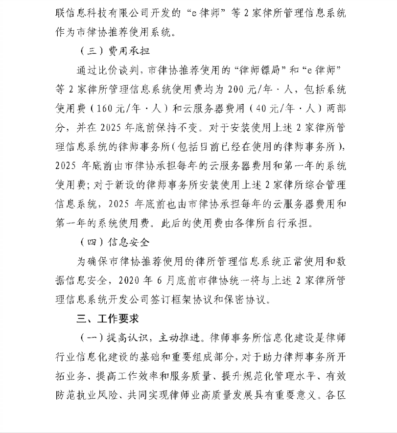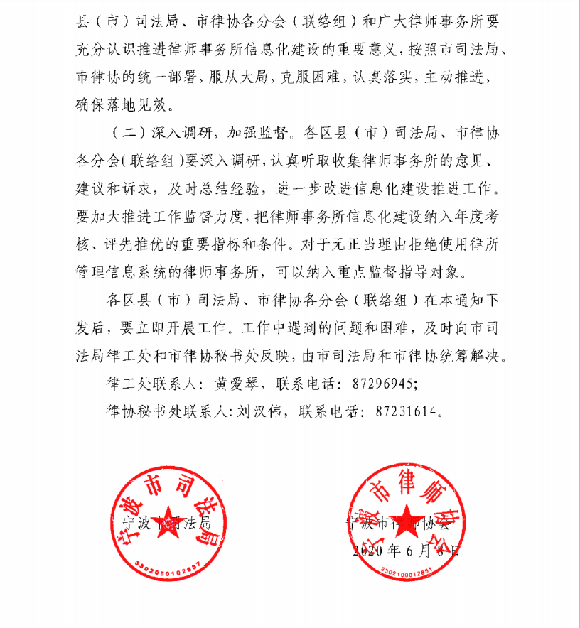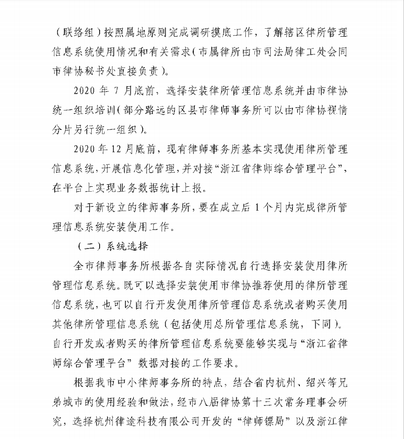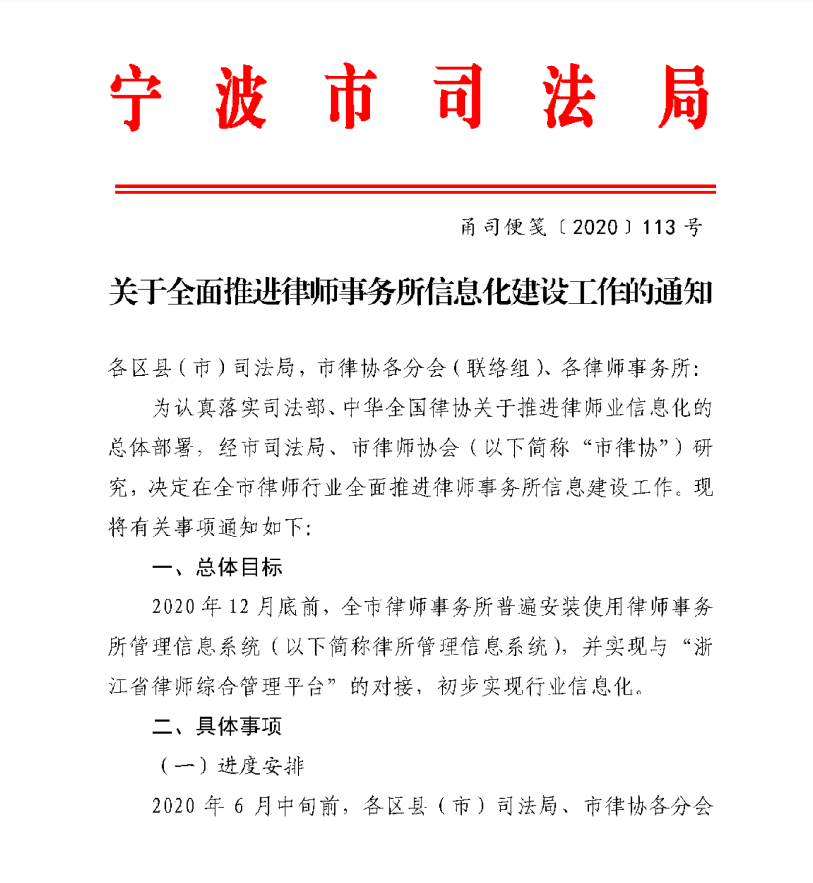 根據(jù)寧波市司法局關(guān)于全面推進律師事務所信息化建設(shè)工作的通知,目標將于2020年12月底前,實現(xiàn)寧波全市律師事務所普遍安裝并使用律師事務所管理信息系統(tǒng),并實現(xiàn)與“浙江省律師綜合管理平臺”的對接,初步實現(xiàn)行業(yè)信息化。