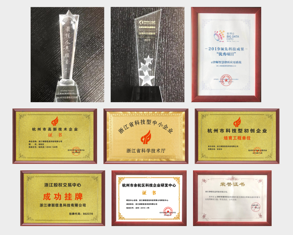 榮獲GLH2019第二屆全球法律科技黑客松大賽武漢賽區(qū)“法律科技創(chuàng)新獎”和“最佳人氣項目獎”;榮獲2019中國國際大數(shù)據(jù)博覽會“優(yōu)秀項目”獎項;榮獲2019全國政法智能化建設(shè)智慧司法優(yōu)秀解決方案獎;軟件著作權(quán)共19項。